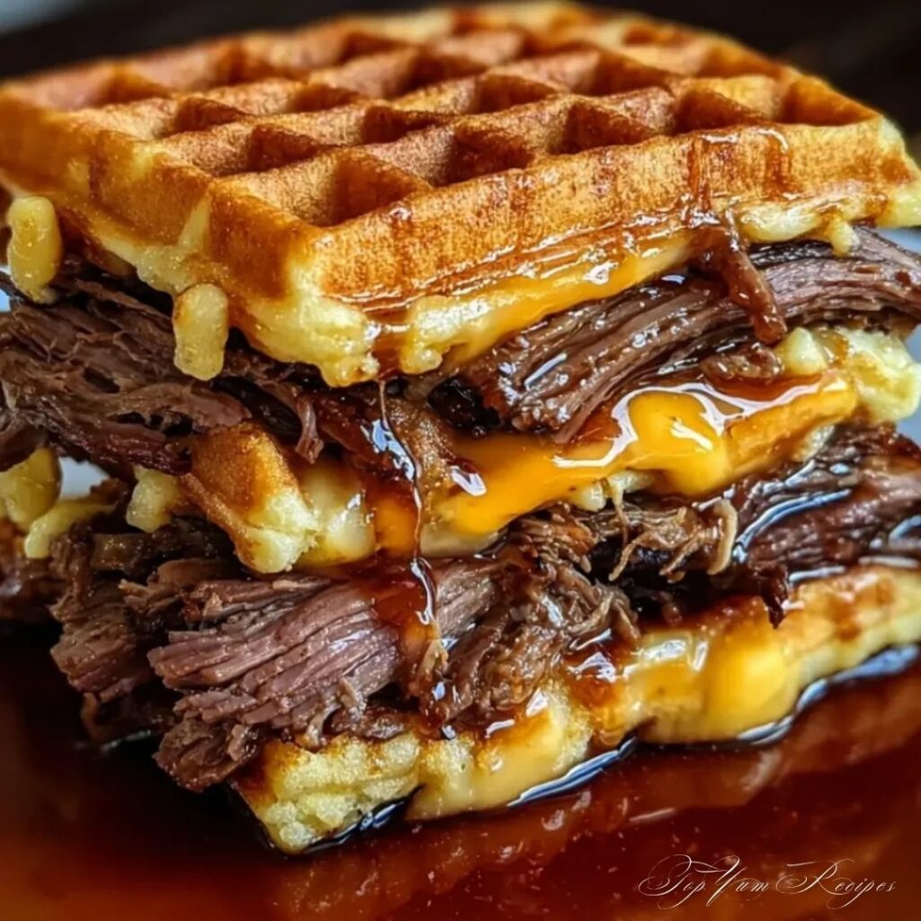 When you serve this dish, you’re not just feeding people; you’re giving them an experience — the smoky scent of brisket, the crisp bite of waffle, the golden drizzle of maple bourbon glaze that ties it all together.